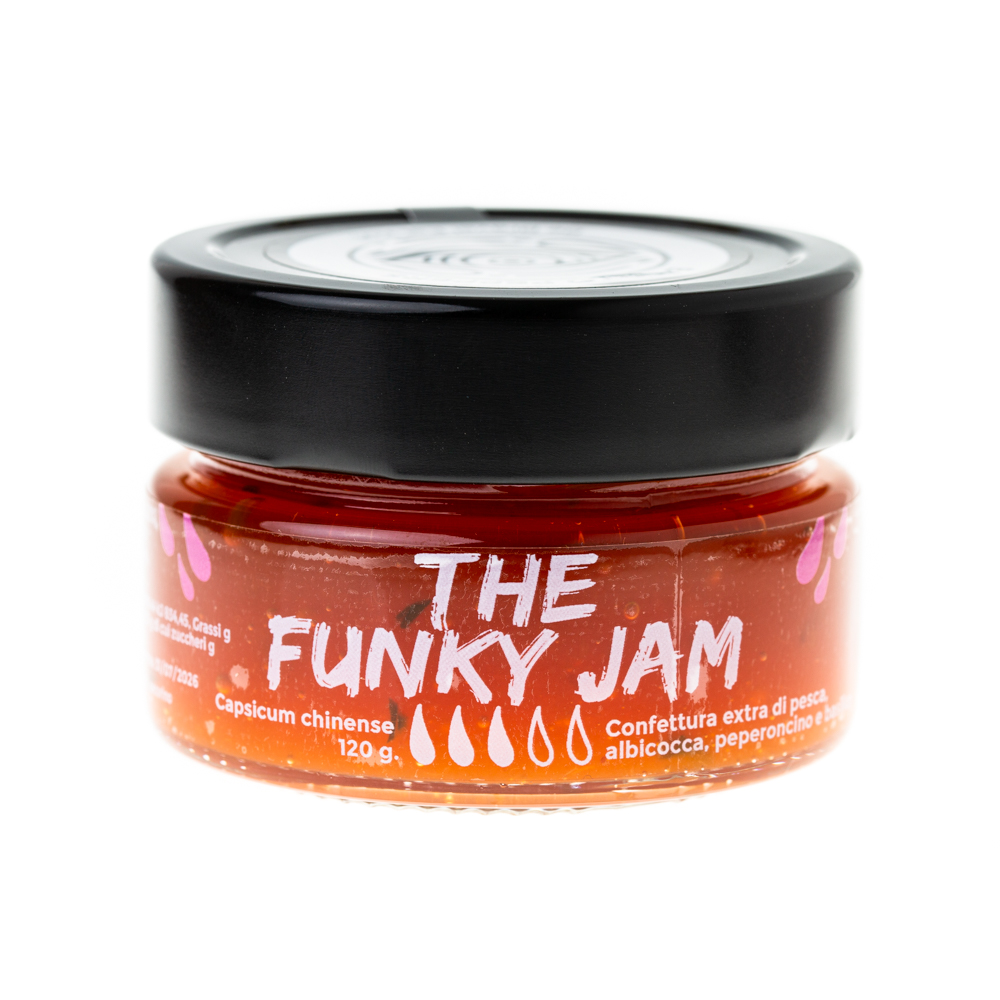 Funky Jam è la composta che mette d’accordo tutti i sensi: pesche e albicocche succose, il profumo intenso del basilico fresco e il calore sorprendente dell’Habanero Giallo. Un mix originale che trasforma ogni boccone in un piccolo viaggio tra dolcezza, freschezza e piccantezza aromatica.