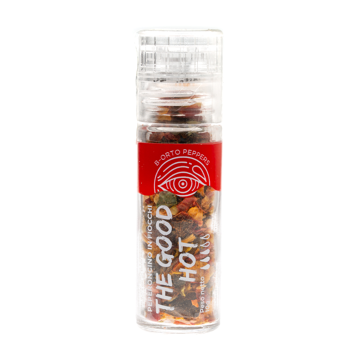 The Good Hot è un mix di peperoncini messicani essiccati in fiocchi, dal livello di piccantezza medio, confezionato in comoda macina per sprigionare aroma e calore al momento dell’uso. Leggermente fruttati e aromatici, i fiocchi mantengono tutto il gusto autentico dei peperoncini freschi, con il vantaggio di poter essere macinati freschi direttamente sui tuoi piatti.