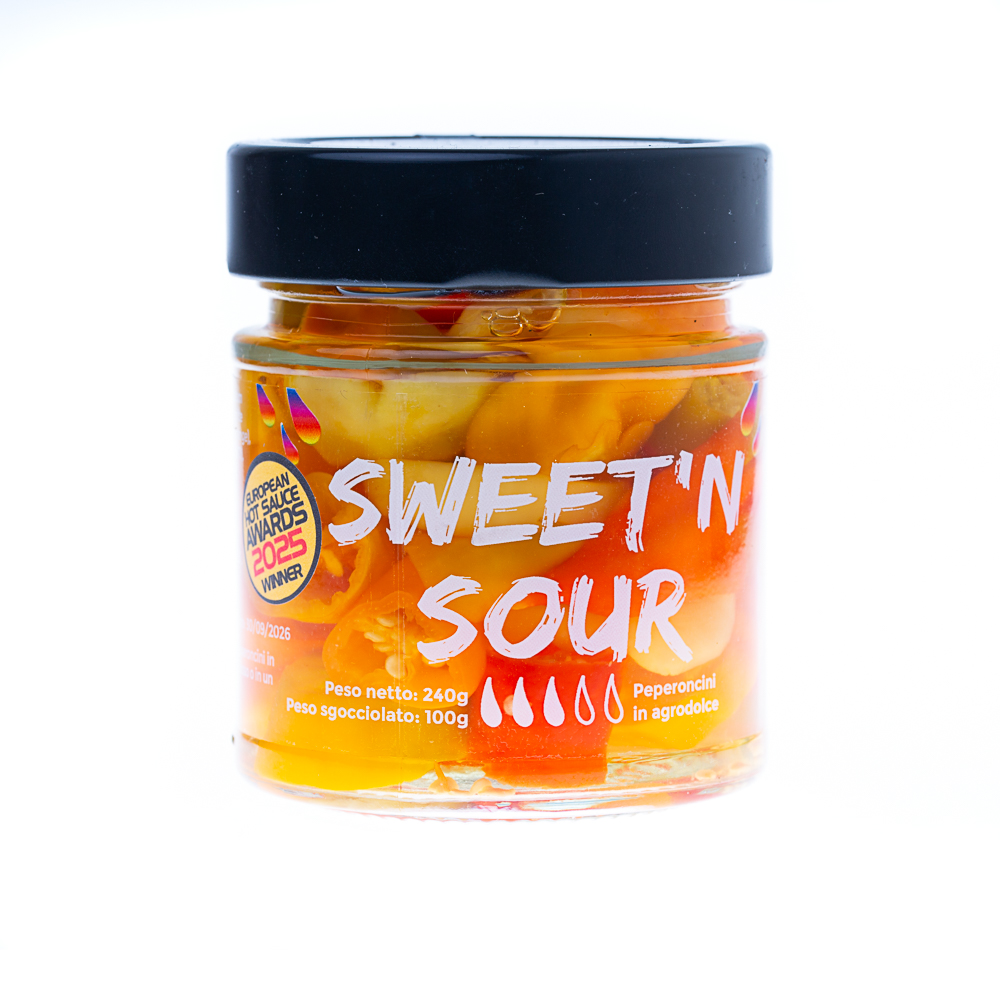 I nostri peperoncini in agrodolce Sweet’n’Sour sono preparati con diverse varietà di Capsicum baccatum, note per il loro aroma fruttato e floreale. Conservati in pezzi e immersi in un equilibrato mix agrodolce, offrono un sapore fresco, aromatico e piccante, perfetto da gustare così o per arricchire piatti e ricette creative. Questa qualità è stata premiata con la medaglia d’oro agli European Hot Sauce Awards.