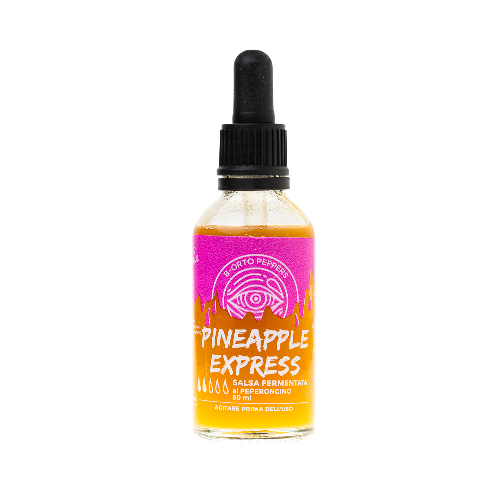 La Pineapple Express è una salsa fermentata artigianale che unisce dolcezza tropicale e piccantezza avvolgente. L’ananas e il peperone giallo incontrano il calore intenso dello Scotch Bonnet (C. chinense), mentre zucchero di canna, cipolla dorata, timo limone, coriandolo e succo di lime creano un equilibrio perfetto tra dolcezza, acidità e freschezza aromatica. Il tutto è completato dal sale affumicato al faggio e dal sale grigio dell’Atlantico, per un tocco di profondità e carattere.
