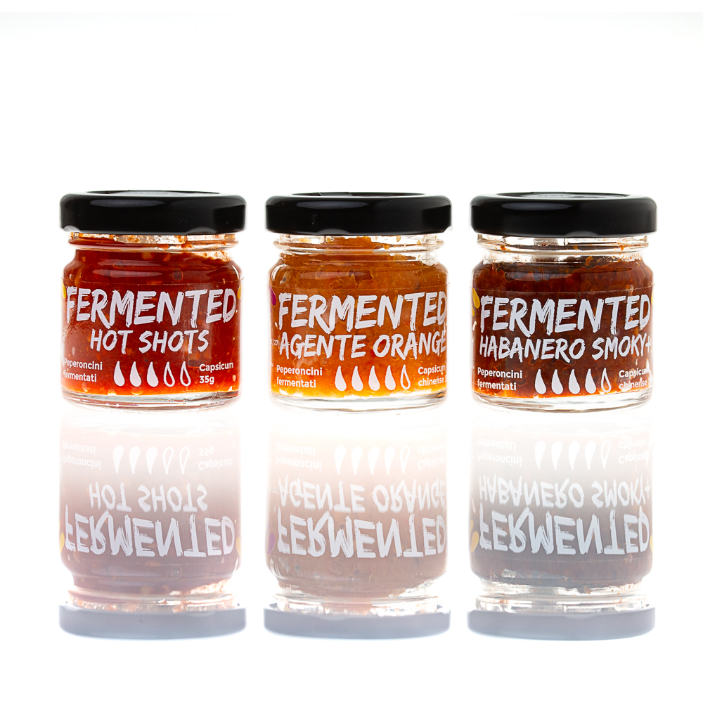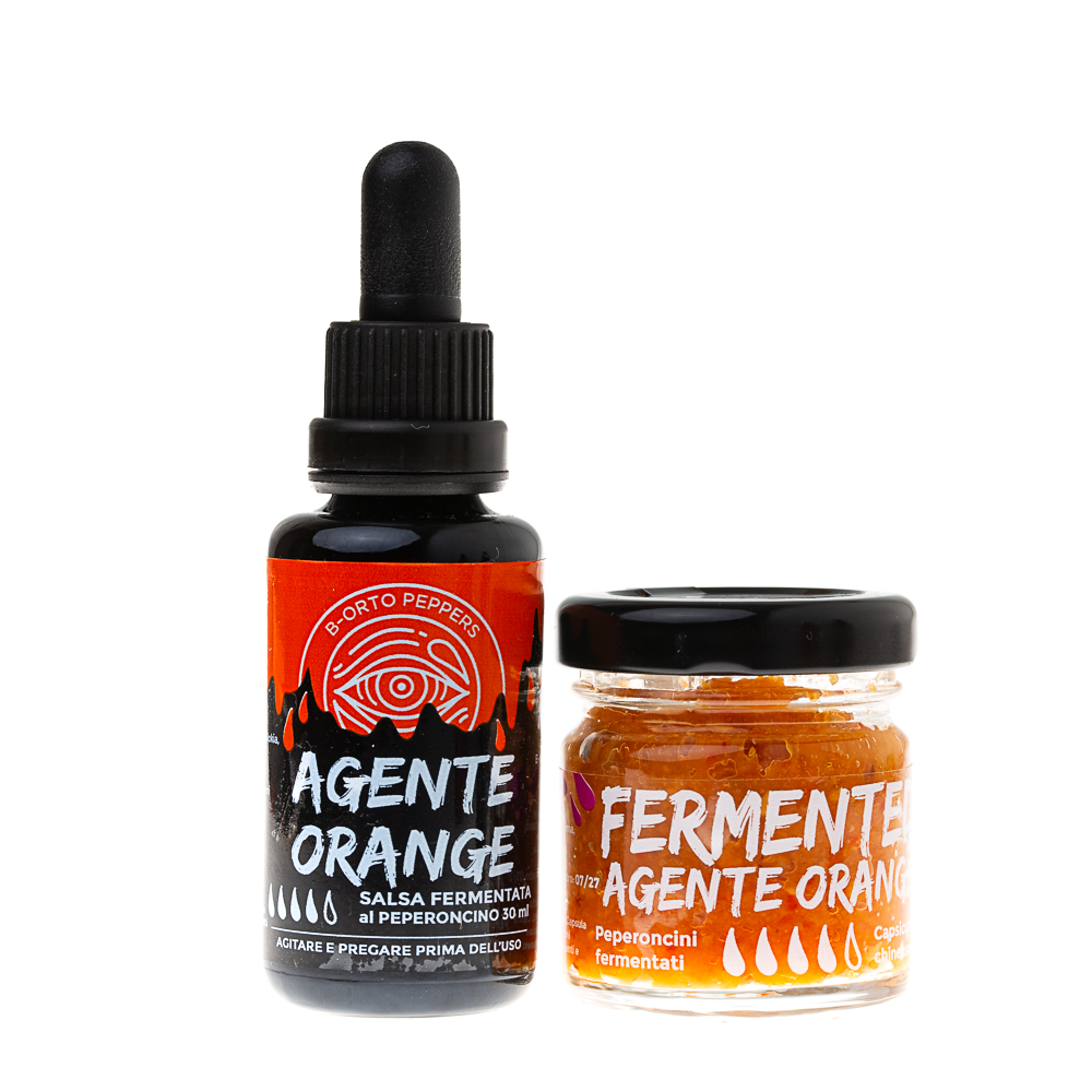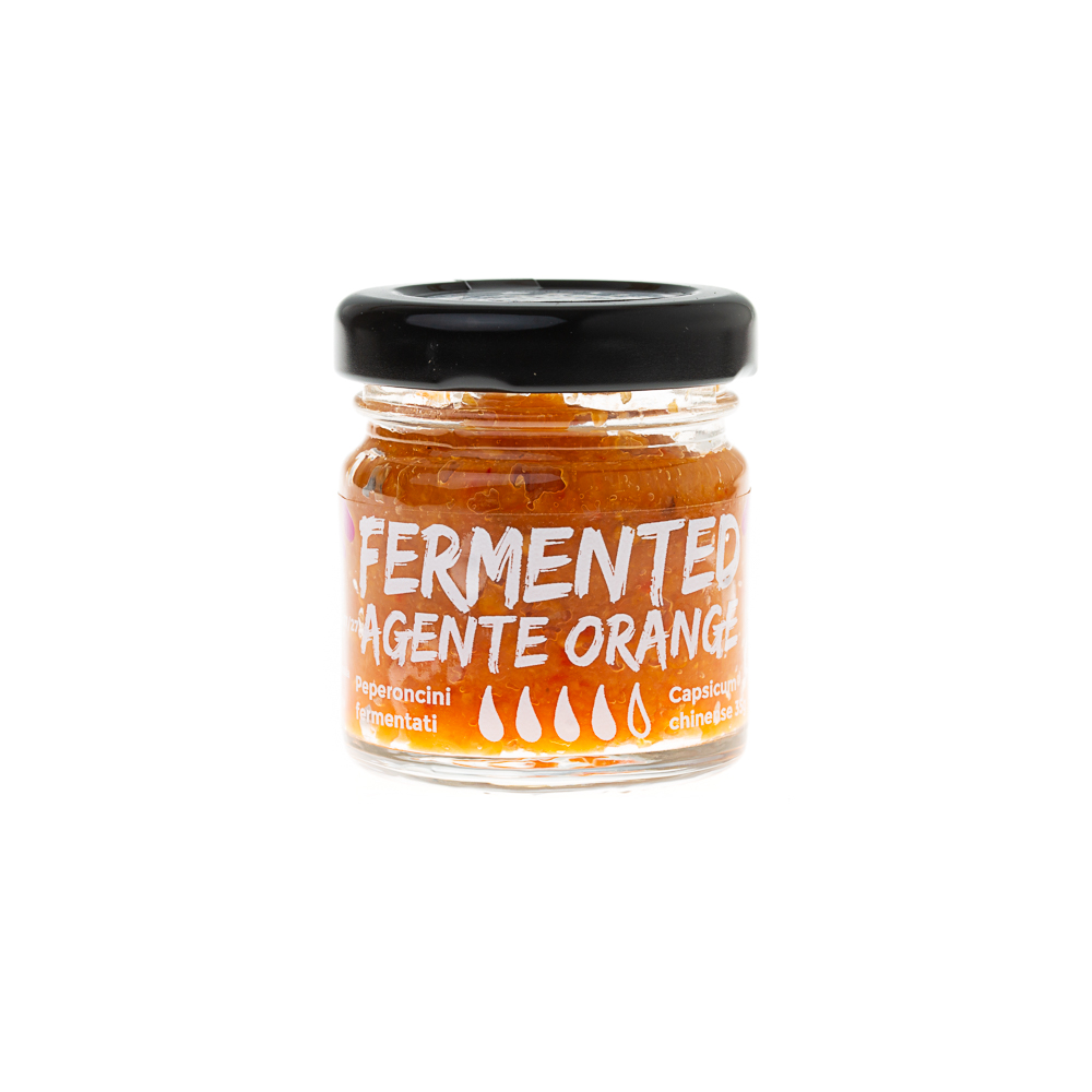 Agente Orange è una crema fermentata artigianale ottenuta esclusivamente da peperoncini Capsicum chinense di varietà arancione — dall’Habanero alle cultivar più rare e piccanti — lavorati con cura per preservarne il profumo fruttato e agrumato.