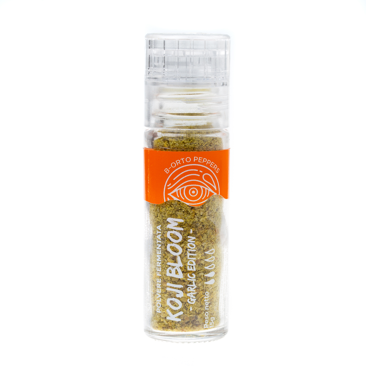Koji Bloom: Garlic Edition è un’esplosione di sapidità e carattere. Questa polvere nasce dalla fermentazione congiunta di Aji Norteño e Aglio, un processo artigianale che trasforma l’intensità pungente dei singoli ingredienti in un bouquet profondo, rotondo e incredibilmente saporito. Come per la versione Mango, la polpa viene essiccata lentamente, preservando la purezza aromatica della fermentazione naturale.